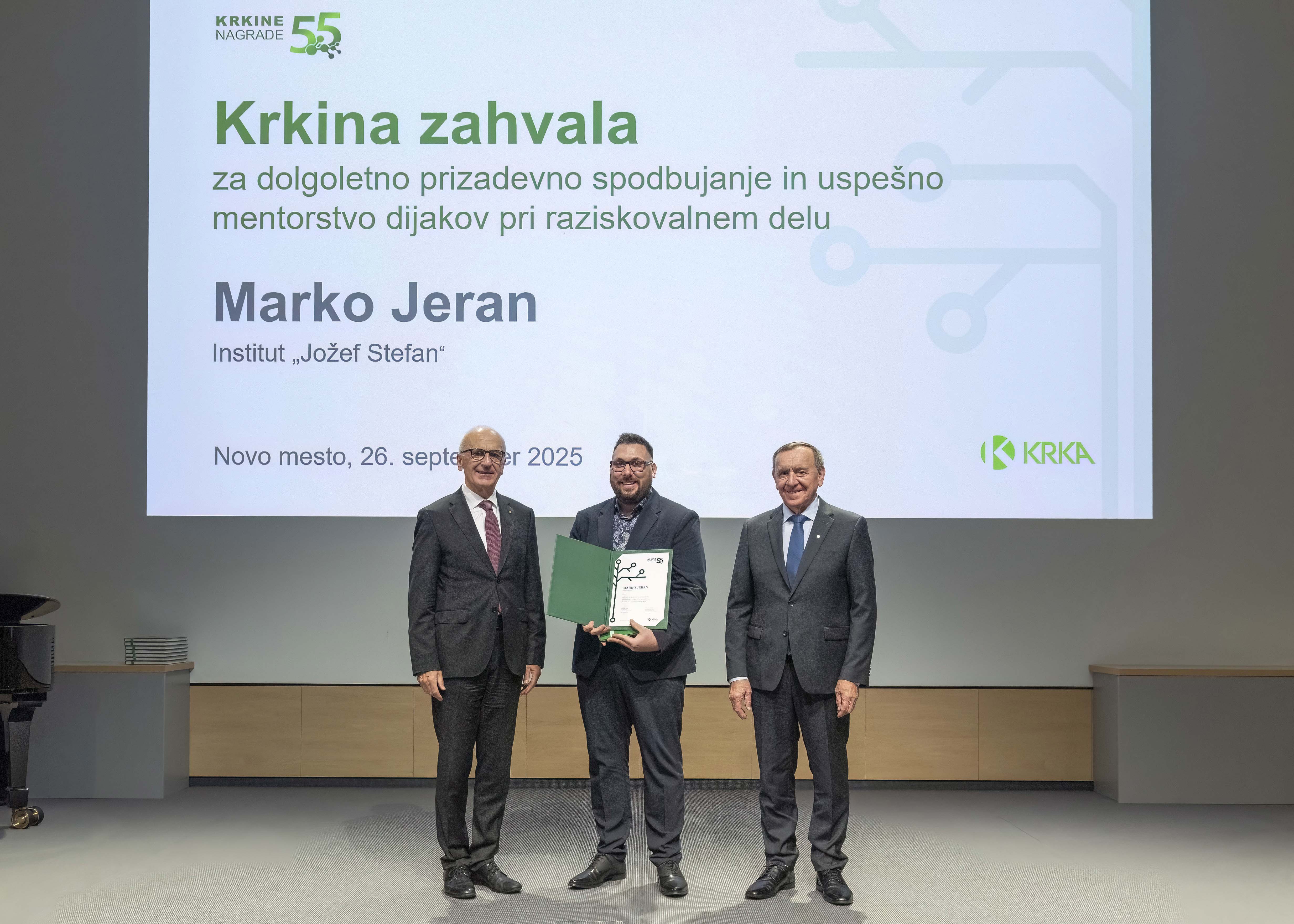 Tudi letos smo za dolgoletno prizadevno spodbujanje in uspešno vodenje dijakov pri raziskovalnem delu podelili posebno plaketo za mentorstvo. Prejemnik je Marko Jeran z Instituta Jožef Stefan, ki že od leta 2015 neprekinjeno sodeluje kot mentor ali somentor pri srednješolskih raziskovalnih projektih – kar 23 jih je bilo prijavljenih tudi na razpis za Krkine nagrade. Njegovo mentoriranje odraža vrednote, ki jih v Krki postavljamo v ospredje: ustvarjalnost, znanje, sodelovanje in odgovornost do prihodnosti.